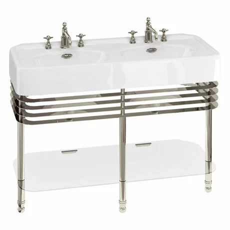 This beautifully designed 1200mm double basin is mounted on a nickel plated steel stand which has a useful integrated glass shelf to store towels or toiletries, available in a choice of 0, 1, 2 or 3 tap holes, this gives the versatile option of pairing it with many of the stunning Arcade taps on offer. Arcade use a unique PVD nickel-finish coating which offers a long lasting finish and is also environmentally friendly. Â
