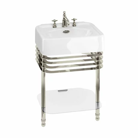 This beautifully designed 600mm basin is mounted on a nickel plated steel stand which has a useful integrated glass shelf to store towels or toiletries, available in a choice of 0, 1, 2 or 3 tap holes, this gives the versatile option of pairing it with many of the stunning Arcade taps on offer. Arcade use a unique PVD nickel-finish coating which offers a long lasting finish and is also environmentally friendly. Â
