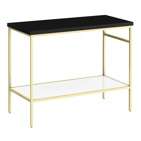 The smart space-saving Arezzo 1010mm wide stone resin matt black stone resin worktop with brushed brass washstand for use counter top basins, brings minimalist luxury to your space with its striking brushed brass lines and cool, gloss white components. The brushed brass framed washstand has an open shelf for storing and displaying your favourite cosmetics, as well as a convenient integrated towel rail. Complete the look with one of our stylish counter top basins, brushed brass basin taps and exposed bottle traps (not included).