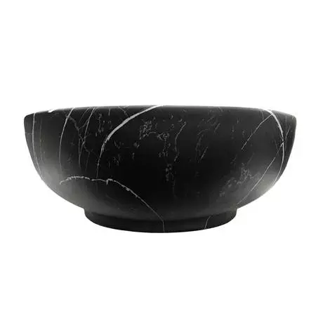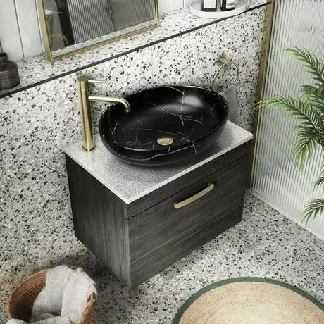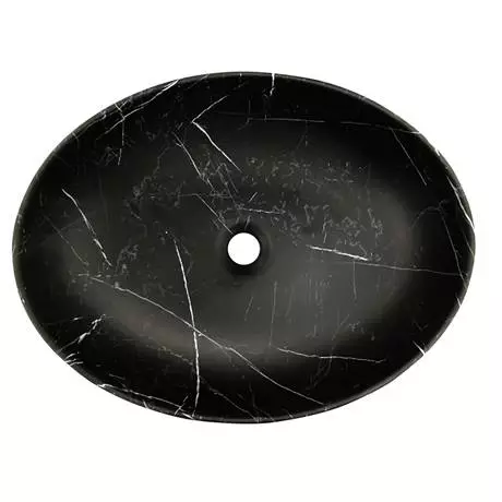 The eye catching luxury Arezzo matt black marble effect counter top basin has a stylish contemporary curved oval shape, perfect for creating a boutique feel in your bathroom. Designed to be mounted onto a worktop console and is best complemented with a high rise basin mixer or wall mounted tap. Manufactured from high quality vitreous china with a painted black marble effect finish. Some small dimensional variation may occur due to manufacturing tolerances. Waste not included.