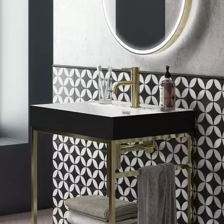 Create a hotel worthy bathroom with the Arezzo Framed Washstand. This freestanding unit brings minimalist luxury to your space, with its striking brushed brass lines and cool, gloss white components. The luxury brushed brass framed washstand has an open shelf for storing and displaying your favourite cosmetics, as well as a convenient integrated towel rail. Its durable polymarble matt black and gloss white includes one tap hole and a thin, modern rim. Why not pair your Arezzo washstand with a coordinating Arezzo Round Brushed Brass Mixer Tap?