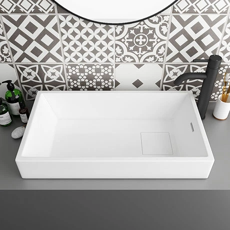 The modern shape of this stylish large rectangular counter top basin will create a contemporary feel in any bathroom, comes with concealed waste cover. Made from high quality vitreous china with a high gloss white finish, this basin is perfect for counter tops and is best complemented with a high rise basin mixer or wall mounted tap. Some small dimensional variation may occur due to manufacturing tolerances. Waste not included.