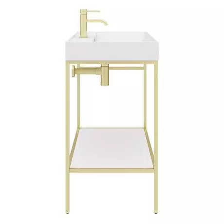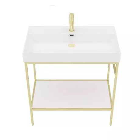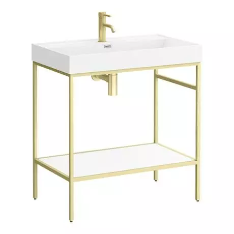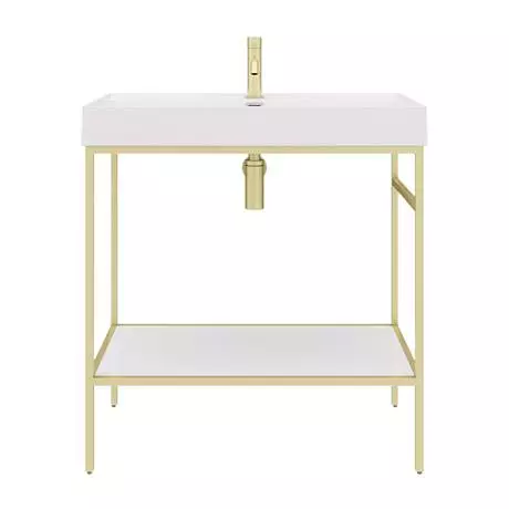 Create a modern, minimalist atmosphere in your bathroom with the Arezzo Brushed Brass Framed Washstand. This 805mm wide, thin edged basin provides plenty of space for washing and its gloss white polymarble construction contrasts beautifully with the durable brushed brass aluminium frame. The open shelf beneath the basin offers ample storage room for your toiletries, while the Arezzo washstand has an integrated towel rail to keep the sink area neat. This floor standing unit arrives preassembled so it’s easy to install. Go for a coordinated look with the Arezzo Brushed Brass Basin Mixer.