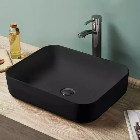 Slender and elegant, the on-trend matt black finish Arezzo Rectangular Counter Top Basin will complement a range of modern bathrooms. At 500mm wide, this countertop basin is designed to sit on top of a flat surface with a high rise or wall mounted tap. The clean lines and curved rectangular bowl maximise the space, while matt black finish will enhance your contemporary style. Pair it with a tap in a contrasting colour – like the Arezzo Brushed Brass High Rise Mono Basin Mixer Tap – for a striking look.