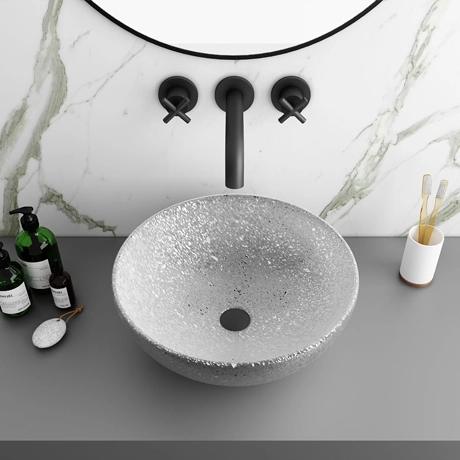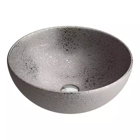 The modern curves of the Arezzo silver mottled design round counter top vessel basin will make a bold visual statement in any bathroom. Made from high quality vitreous china, the basin is perfect for counter tops and is best complemented with a high rise basin mixer or wall mounted tap. Some small dimensional variation may occur due to manufacturing tolerances. Waste not included.