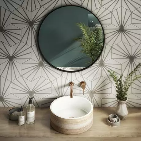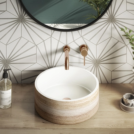 Featuring a rustic texture on the outside and gloss white finish on the inside, the Arezzo round countertop vessel basin will create a touch of finesse in any bathroom. Made from high quality vitreous china, this chic basin can be fitted to a vanity unit or shelf for a stunning focal point and is best complemented with a high rise basin mixer or wall mounted tap. Some small dimensional variation may occur due to manufacturing tolerances. Waste not included.