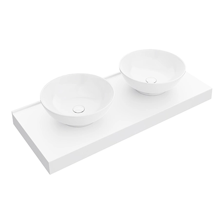 The luxury Arezzo large stone resin wall hung floating shelf with 2 round gloss white ceramic counter top basins features stylish minimalist clean lines. Perfect for maximising space and for creating a boutique feel in your bathroom. Supplied undrilled to allow flexible positioning for your basin and tap. If you want to make a statement with your bathroom design, then choose from our luxury basin shelf collection, made from quality solid stone resin composite with a stunning matt finish. Â