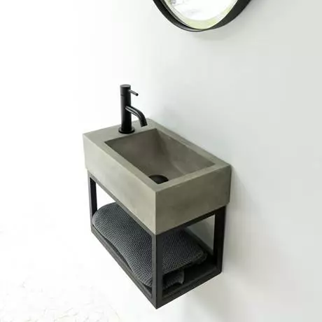 The space-saving rugged Arezzo Stone Natural Concrete wall hung cloakroom basin with matt black towel shelf, prefect for creating the perfect cloakroom. The Arezzo stone range encapsulates modern industrial design, provides you with a handy space-saving solution for your cloakroom or en-suite. Distinctive edges are divided by a sweeping natural curve making this miniature concrete basin a humble classic. Features a practical minimalist matt black towel shelf ideal, perfect for use where space is premium, freeing up as much precious floor space as possible. Waste and bottle trap not included.