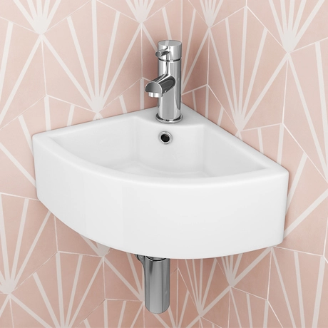 Make the most of a small bathroom with the wall mounted Bermuda Corner Cloakroom Basin. With a compact width, it slots easily into tight spaces. This small corner sink is made from a high quality and easy to clean gloss ceramic. It has one tap hole for adding a space saving mixer tap and is finished with a modern curved front.