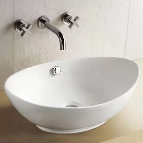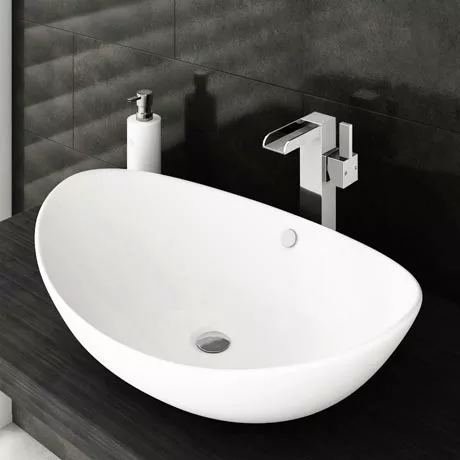 The stylish 580mm wide oval shaped counter top basin with a modern waterfall high rise mono basin mixer, designed to be mounted onto a worktop console or piece of vanity furniture. The basin comes with no tap holes.