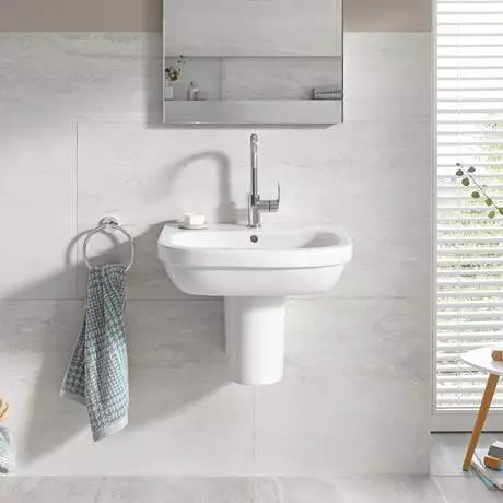 The Euro Ceramic range has been specially designed to match up an excellent performance with an attractive price. This Euro Ceramic 550mm basin and half pedestal will make a subtle difference to any bathroom look. It features a single tap hole and built in overflow. Manufactured from high grade vitreous china and finished in Alpine White, it’s durable surface will look good for years to come.Â