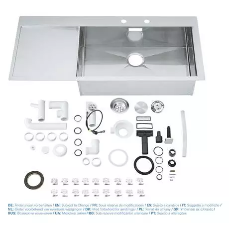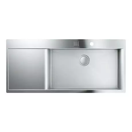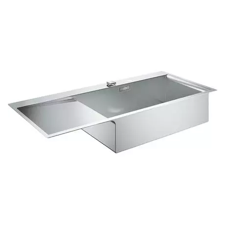 The Grohe K1000 stainless steel sink is the perfect kitchen centrepiece with crisp, contemporary lines matched by superior quality steel. Designed to be flush mounted for a seamless look with your worktop, the sink has a deep bowl that can comfortably fit large pans and is available in a left or right hand option. Made from durable GROHE StarLight AISI 304 grade stainless steel for durability while GROHE Whisper insulation on the underside reduces noise and vibration. The automatic waste fitting with remote control means you never have to reach into dirty water to pull the plug.
