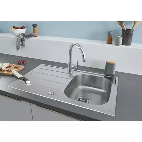 The Grohe K200 1.0 Bowl Stainless Steel Kitchen Sink is a practical, durable fit for any kitchen. The sink has two pre-drilled tap holes, meaning that it is fully reversible. The sink offers plenty of internal space, with a bowl depth of 16cm, meaning even large pans will fit comfortably. The sink is made from GROHE StarLight AISI 304 grade stainless steel, meaning it is both durable and attractive with a sparkling finish. GROHE Whisper insulation on the underside of the sink dampens noise, and the automatic waste fitting with remote control means you can pull the plug without having to put your hand in the dirty water.