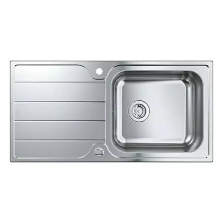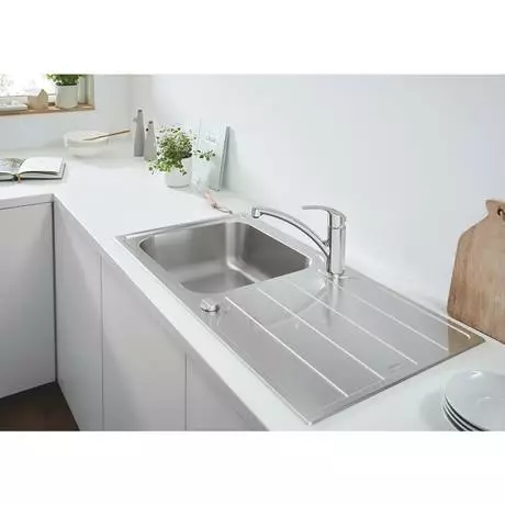 The Grohe K500 1.0 Bowl Stainless Steel Kitchen Sink is a practical, durable fit for any kitchen. The sink has two pre-drilled tap holes, meaning that it is fully reversible. The sink offers plenty of internal space, with a bowl depth of 16cm, meaning even large pans will fit comfortably. The sink is made from GROHE StarLight AISI 304 grade stainless steel, meaning it is both durable and attractive with a sparkling finish. GROHE Whisper insulation on the underside of the sink dampens noise, and the automatic waste fitting with remote control means you can pull the plug without having to put your hand in the dirty water.