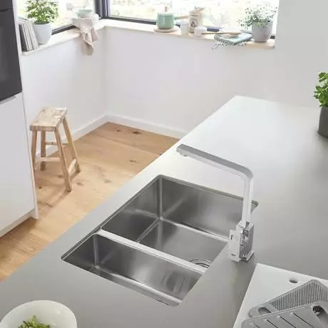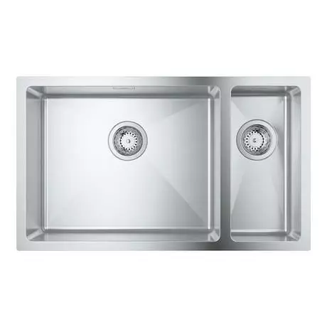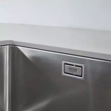 The Grohe K700 1.5 bowl undermount stainless steel combines contemporary sleek style with practicality. Designed to be undermounted beneath a worktop, the sink has a deep main bowl that is designed to to be mounted on the left. Made from durable GROHE StarLight AISI 304 grade stainless steel for durability while GROHE Whisper insulation on the underside reduces noise and vibration. Includes minimalist square-shaped overflows and basket strainer wastes.