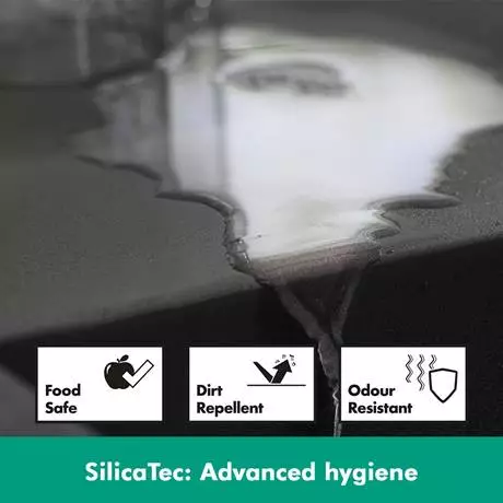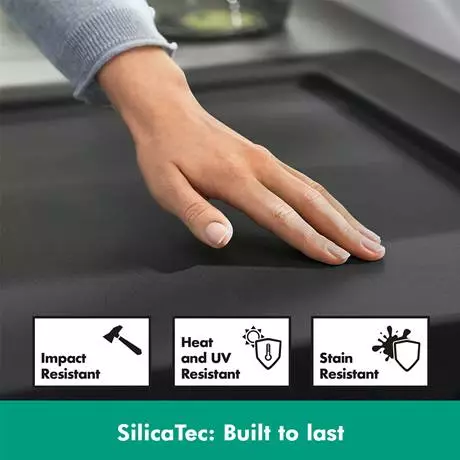 A hard, non-porous composite of quartz and acrylic, SilicaTec Granite is a patented material used to create hansgrohe’s long-lasting kitchen sinks. Smooth to the touch, SilicaTec surfaces are highly resistant to food stains, scratches, knocks, and dents. You’ll also benefit from its ability to deaden the sound of running water; for quieter, atmospheric kitchens.