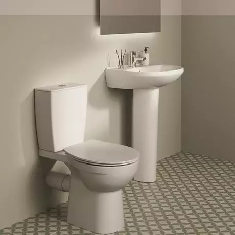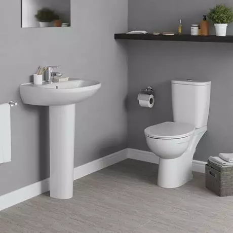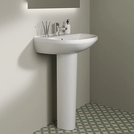 The Evrovit collection balances a mix of round and rectangular shapes. This basin and full pedestal is made from high grade vitreous china with a cool white finish and features a single tap hole. Suitable for hotels, office buildings as well as domestic. The Evrovit range offers comfort and additional safety in the bathroom.