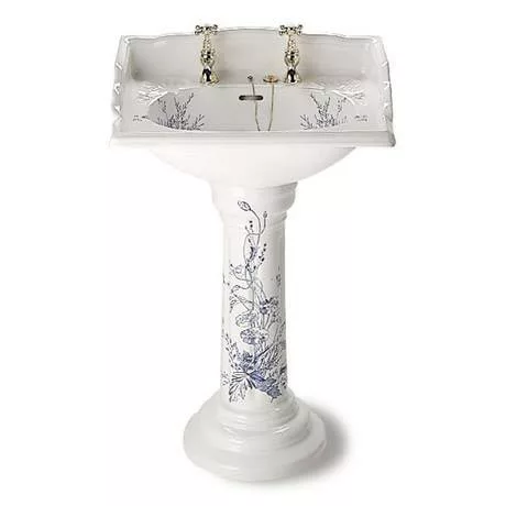 A beautifully traditional Victorian blue garden pattern 635mm wide basin with unfluted standard height pedestal, hand crafted by Silverdale Bathrooms from the finest china clay. Featuring a elegant blue garden pattern which has been fired into the glaze and classic square forms with distinctive high splash backs. Each individual piece of sanitary ware has been carefully considered in its design, being based on authentic original pieces and lovingly re-created.