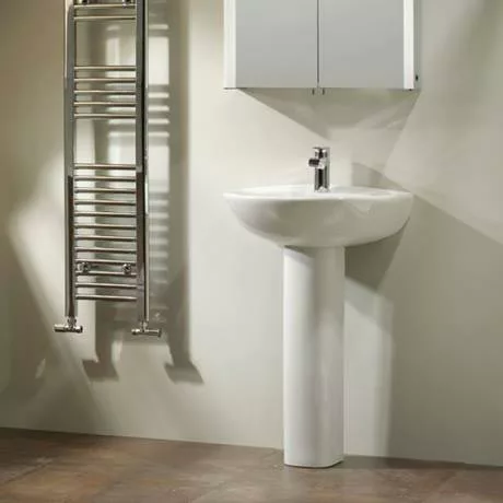 The Micra 565mm ceramic basin and pedestal is ideal for the smaller bathroom, cloakroom or en-suite thanks to its compact design. Manufactured from high grade ceramic and finished in gloss white. The basin comes paired with a pedestal and is available in a 1 or 2 tap hole option and features an integrated overflow.Â