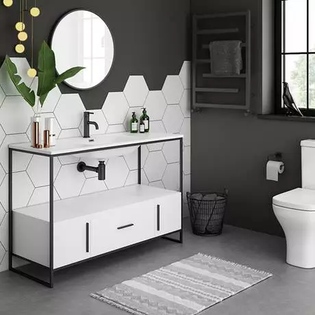 If you want to make a statement with your bathroom design, then choose the contemporary large Venice 1200mm wide free standing 1-drawer, 2-cupboard washstand. Features a designer spacious stone resin basin with a stunning matt white finish to complement the matt black washstand. This elegant minimalist washstand would look great with one of our modern matt black basin taps and bottle traps (sold separately).