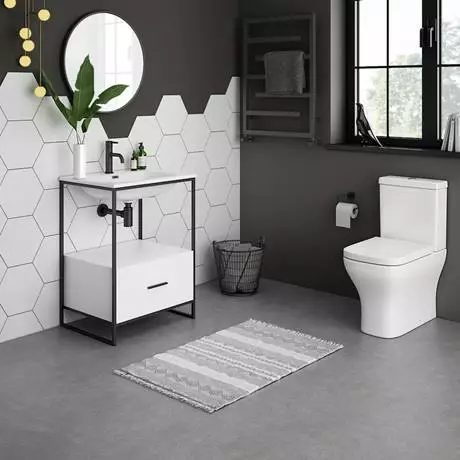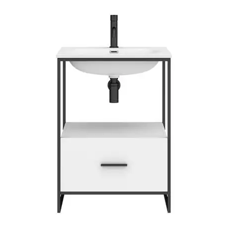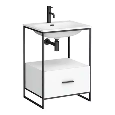 If you want to make a statement with your bathroom design, then choose the contemporary Venice 600mm wide free standing 1-drawer washstand. Features a designer stone resin basin with a stunning matt white finish to complement the matt black washstand. This elegant minimalist washstand would look great with one of our modern matt black basin taps and bottle traps (sold separately).